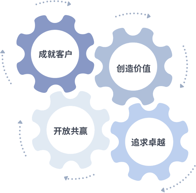 成就客户是一切决策的出发点,,,,创造价值是衡量所有工作的标准,,,,追求卓越是我们做事做人的态度,,,,开放共赢是我们的格局也是最终的结果。。价值观的齿轮环环相扣,,推动着组织里的每个人不断向前。。